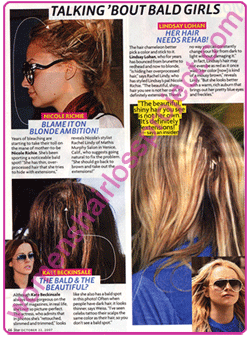 I was at the grocery store yesterday when a magazine caught my eye. It is this month’s Star Magazine. It has a big title sprawled across the cover, “Hollywood Stylists Tell All!” and beneath it with a nice pink asterisk, it says “Who’s really bald.” Obviously I wasn’t going to make it out of the grocery store without this new item in tow, nor could I wait to paw through the pages until I came across the section it made reference to on the cover. It said “Talking’ Bout Bald Girls” and has 3 images of the heads of celebrities, Nichole Richie, Kate Beckinsale, and Lindsay Lohan.